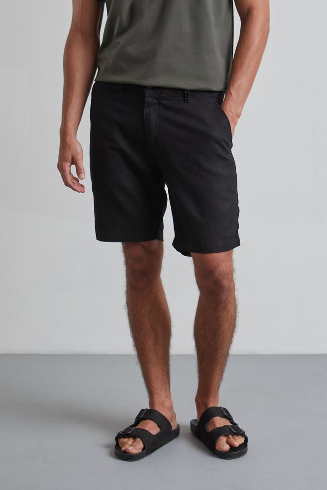 Bermuda frente plana desenvolvido em tecido com mistura de fibras de linho e viscose.
