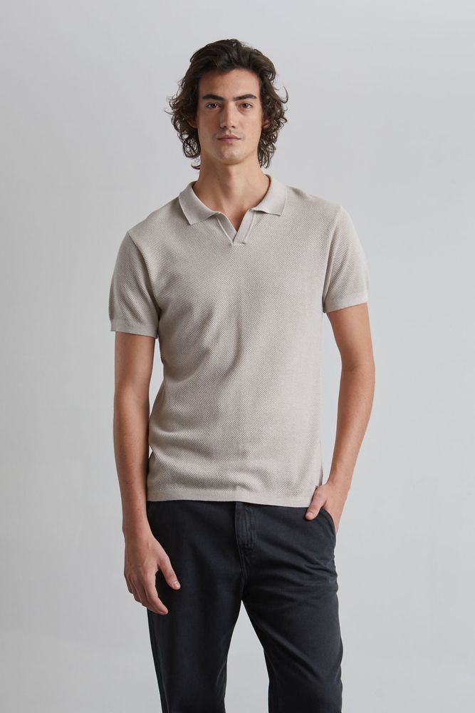 Polo desenvolvida em tricot leve e texturizado com a mistura de algodão e acrílico.