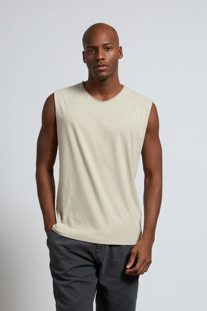 Regata em malha 100% algodão com modelagem de t-shirt sem mangas. Produto pré lavado e amaciado em processo artesanal de lavanderia.