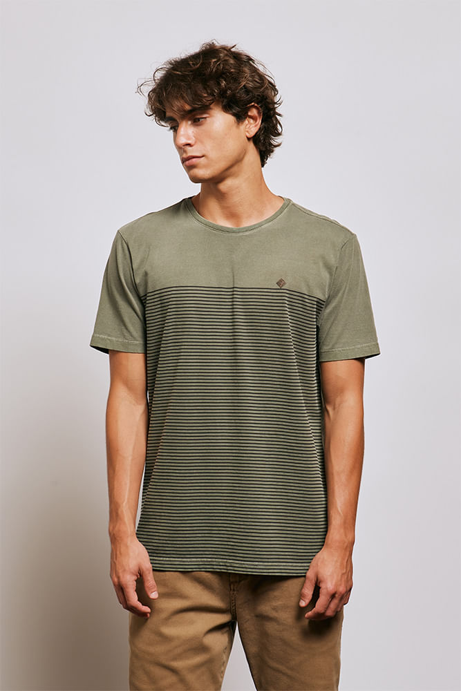 T-shirt manga curta em malha 100% algodão Produto pré lavado em processo artesanal de lavandeira. Malha com caimento leve e modelagem, seguindo o padrão Armadillo Silk frontal exclusivo desenvolvido pela Armadillo em listras horizontais slim que garantem um visual casual e minimalista. Destaque para etiqueta tatu couro, assinando a peça. Produto produzido 100% no Brasil.