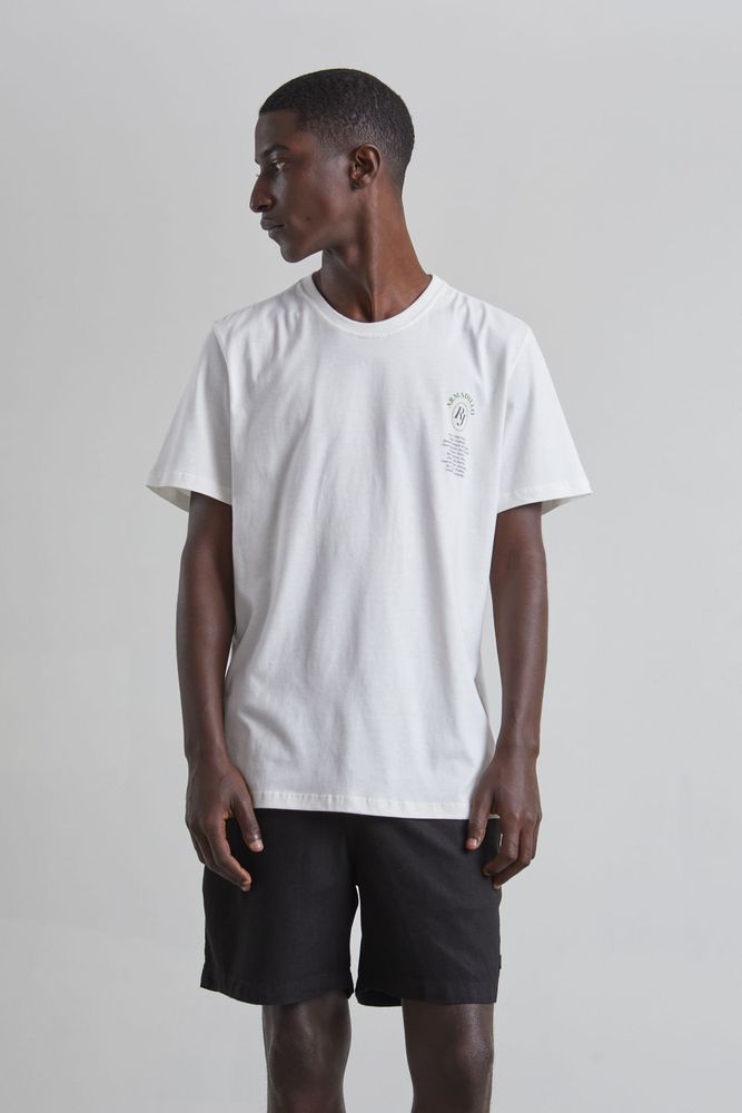 T-shirt manga curta em malha 100% algodão e peletizada, certificado BCI. Produto amaciado em processo artesanal de lavanderia.